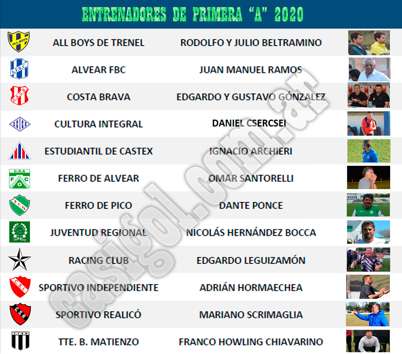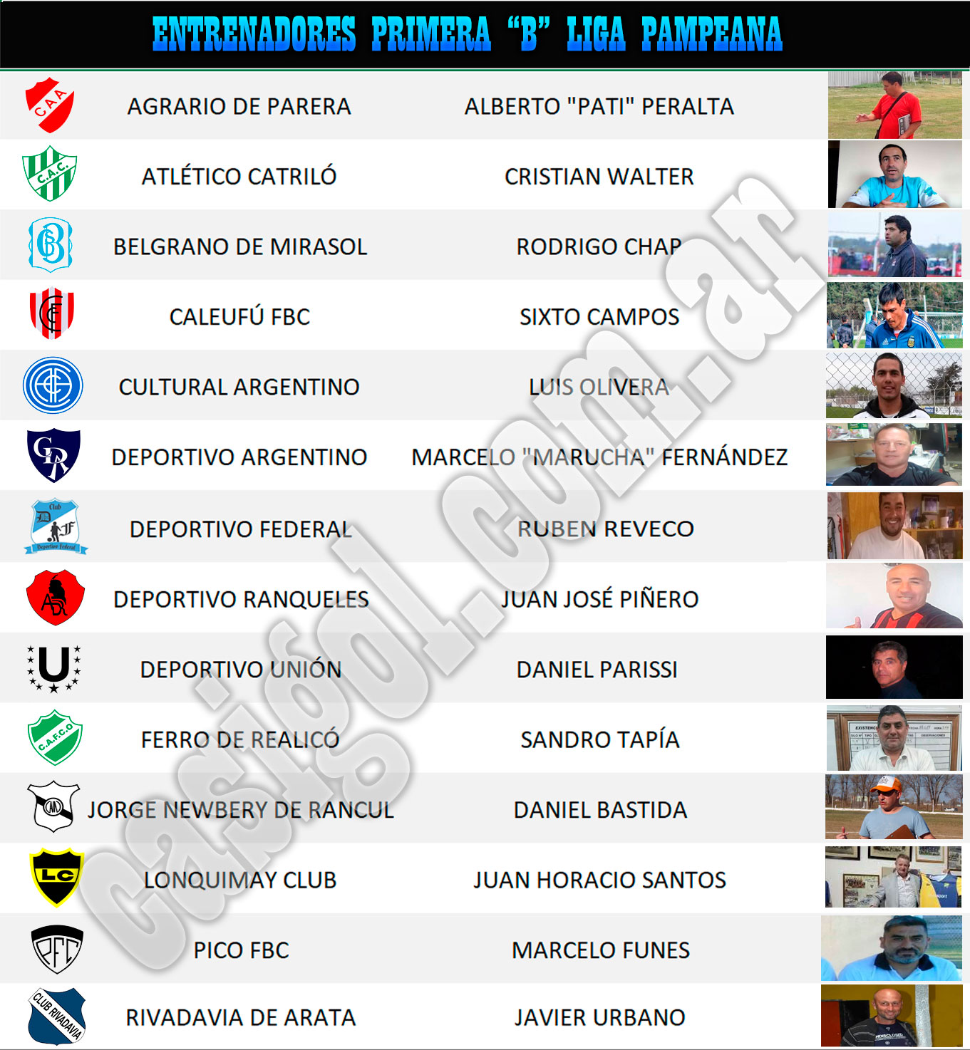 Se viene la temporada futbolística de Liga Pampeana y se a generado una gran expectativa tanto en primera "A" como en el ascenso. Desde Diciembre, que los clubes en gran esfuerzo confirmaron sus entrenadores y se reforzaron de muy buena manera, lo cuál hace presagiar que tendremos una temporada de gran nivel, y ojalá con canchas llenas.  Dejamos para ustedes los entrenadores  en ambas divisionales, que  ya están en pretemporada con sus clubes desde mediados de Enero. Ellos son los siguientes: