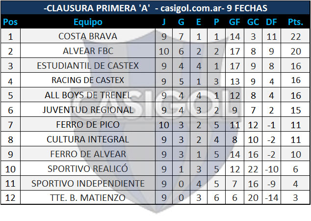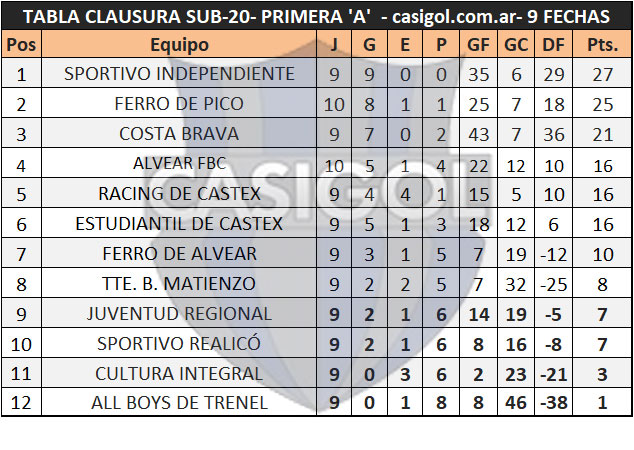 TABLA SUB 20 - CLAUSURA  LIGA PAMPEANA