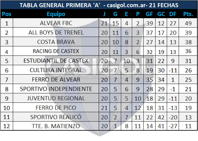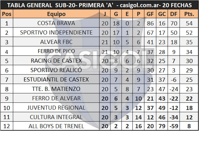 TABLA GENERAL SUB 20  LIGA PAMPEANA