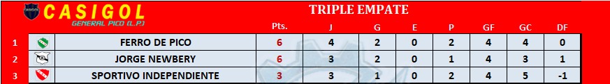 Esta es la tabla del triple empate, a la cual le falta el encuentro del domingo entre Jorge Newbery y Sportivo Independiente, por lo tanto ésta ubicación no es correcta por estar incompleta. Aún así la dejamos para que puedas hacer tus probablidades.