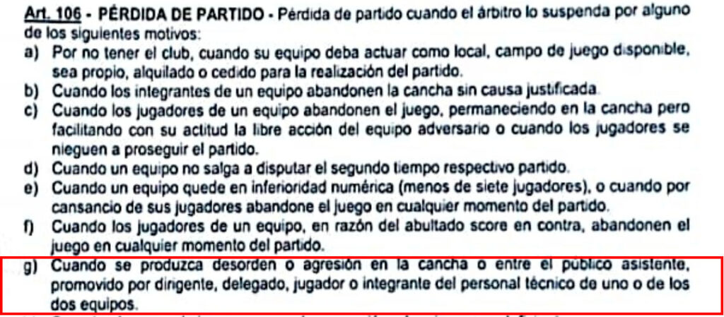 Debido a que hay un aspecto del reglamento que explica en el punto G de su artículo 106, las causales de pérdida de puntos de un club. Pero reiteramos es solo nuestra humilde apreciación y será el tribunal de disciplinas de Liga Pampeana quien tomará dicha decisión al respecto.