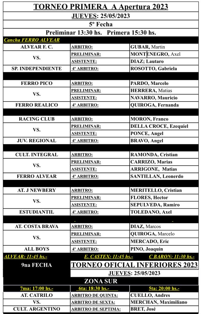Se conocieron los árbitros para la quinta fecha del torneo de Liga Pampeana de primera división que se disputará en el día de mañana en horario oficial, como así también el adelantado de divisiones inferiores entre At. Catriló y Cultural Argentino en sus tres categorías.