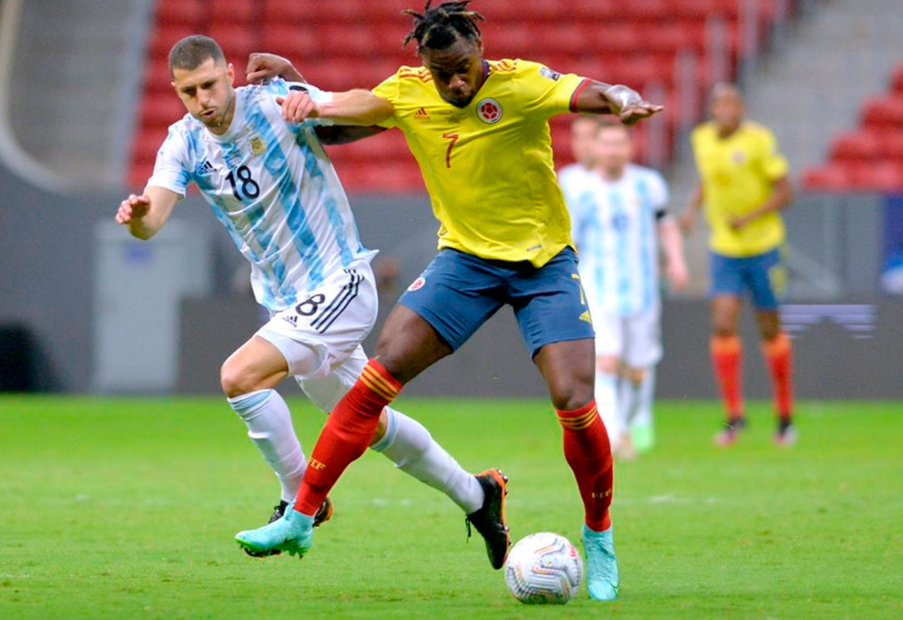Por la segunda semifinal se enfrentaron Argentina y Colombia por un lugar el Sábado ante Brasil, para determinar el campeón de la Copa América. Comenzó mejor Argentina hasta que a los 7' gran pase de Lo Celso, para Messi dentro del área giró y dio el pase hacia atrás para que Lautaro Martínez defina sobre la mano derecha del arquero Ospina que nada pudo hacer. Pero con la ventaja el equipo Nacional, se retrazó, ante un Colombia que se hizo de la pelota y por los costados complicó a la Argentina. Tuvo algunas de contra pero el dominio siempre fue del conjunto cafetero que por el lado de Díaz contra Molina y Cuadrado con Tagliafico lllevaron mucho peligro y por suerte para la albiceleste no pudieron concretar.