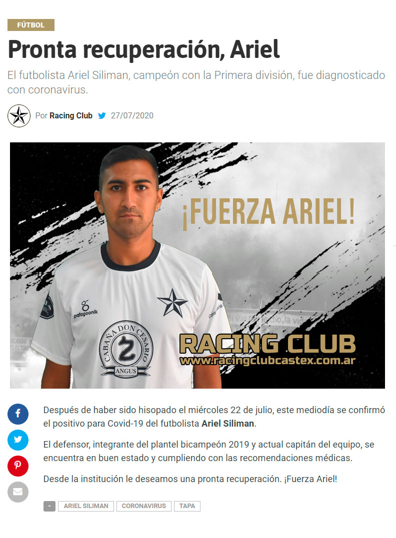 El defensor de Rácing Club de Eduardo Castex, Ariel Siliman fue diagnosticado con coronavirus. La información la confirmó el club albo castense en su sitio oficial. El Miércoles 22 de Julio se realizó el hisopado, tras tener síntomas del virus que a ocasionado la pandemia mundial. En el día de hoy le entregaron el resultado y el diagnóstico fue positivo de covid 19.