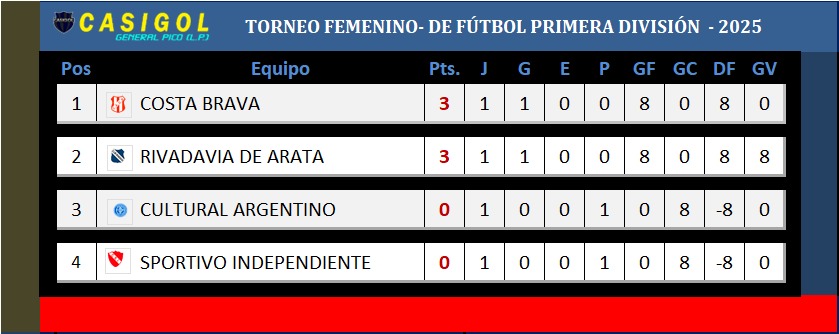 En primer turno, se disputó el encuentro entre Costa Brava y el debutante Sportivo Independiente. Fue triunfo del conjunto albirrjo por ocho a cero, con cinco de Peters y tres de Luján Campo.
