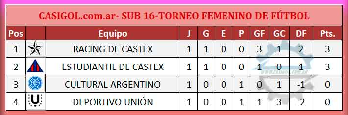 En la mañana de hoy dio inicio el torneo femenino de fútbol, para la categoría sub 16, en la cuál todo inició con cuatro equipos. Ellos son Estudiantil y Racing de Castex, Deportivo Unión y Cultural Argentino. En primer turno las chicas del "albo" de Castex derrotaron al local, por tres a uno y en segundo turno el "Bohemio" dio cuenta de Cultural Argentino por uno a cero.