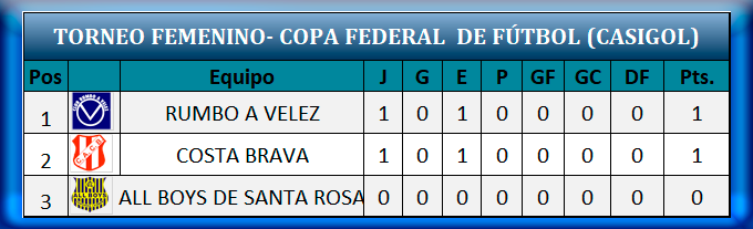 En la fría tarde de hoy dio inicio el torneo federal femenino de fútbol en el cuál participan los clubes pampeanos de Costa Brava, Rumbo a Velez y All Boys de Santa Rosa. Se llevó a cabo en el nuevo Pacaembú el acto inaugural en el cuál estuvieron autoridades provinciales municipales, de Liga Pampeana, Cultural y también los presidentes de los clubes Costa Brava y Rumbo a Velez. En esta zona de la Región Pampeana Sur, también está All Boys de Santa Rosa que hoy tuvo libre y en la próxima recibe a Costa Brava en el Ramón Turnes.