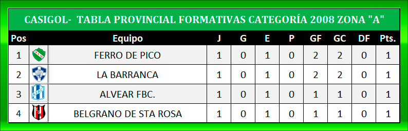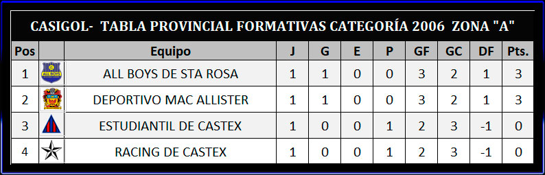 En el "Héctor Nervi- la fortaleza Alba" por la zona "A" de categoría 2006 Dep. Mac Allister derrotó a Racing por tres a dos y en el Estadio de la Avenida San Martín de Intendente Alvear, el azul igualó con Belgrano en la zona "A" de categoría 2008 un tanto por lado. Tras completarse la fecha así quedaron las tablas de posiciones y lo que se viene en la segunda fecha.