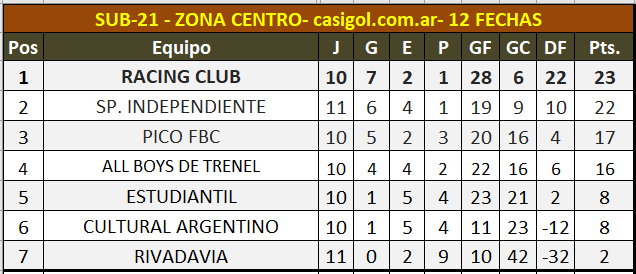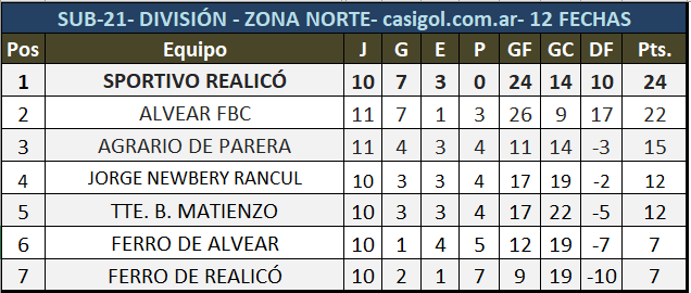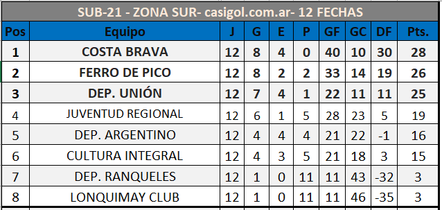 Se disputó la duodécima fecha del torneo de Liga Pampeana de fútbol, en sub21- La jornada había comenzado en el día de ayer con el triunfo de Alvear por tres a cero en su visita a Rancul por la zona norte y por la sur Costa Brava derrotó a Deportivo Argentino dos a cero en el "Carlos Sierra". Hoy se disputaron nueve partidos y estos fueron los resultados, las tablas y lo que se viene en la 13, para los juveniles. El próximo miércoles disputarán el clásico de la especialidad entre Alvear FBC y Ferro de Alvear.