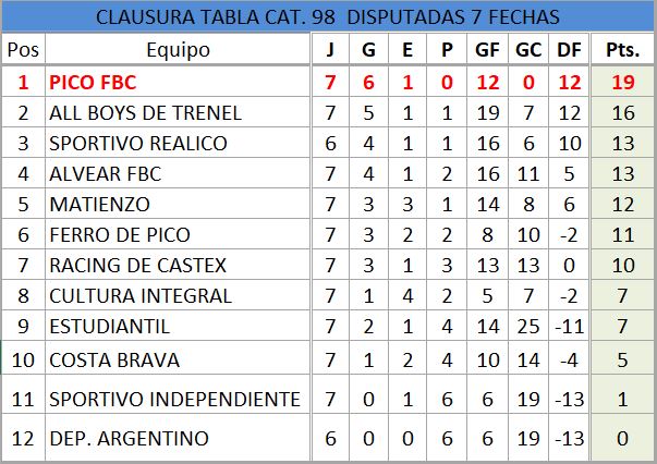 Se completó la fecha en categoría 1998, y disputadas siete fechas, continúa siendo Pico FBC, quien manda en el segundo torneo del año. Hoy igualó sin abrir el marcador con Sportivo Realicó  ganador del torneo Apertura.