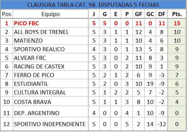 Tras cinco fechas disputadas del torneo clausura en categoría 1998, manda Pico FBC, con puntaje ideal, producto de cinco victorias consecutivas y sin goles en contra.