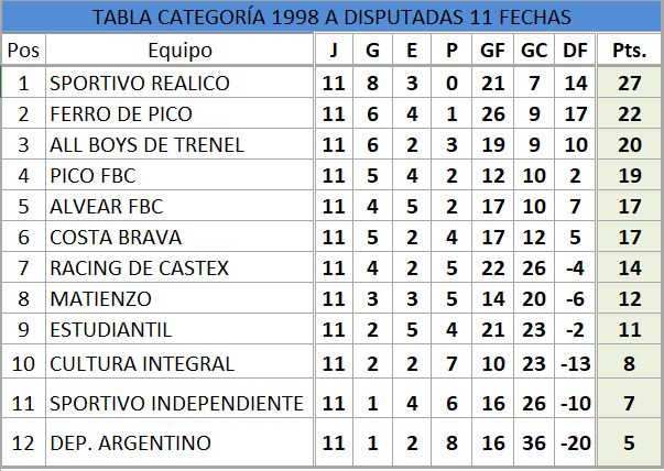 Por categoría 1998, Sportivo Realicó fue el ganador del Torneo Apertura tras vencer a All Boys de Trenel por uno a cero, al tiempo que Ferro no pudo ganar en el olímpico. SÍNTESIS DE LA JORNADA.