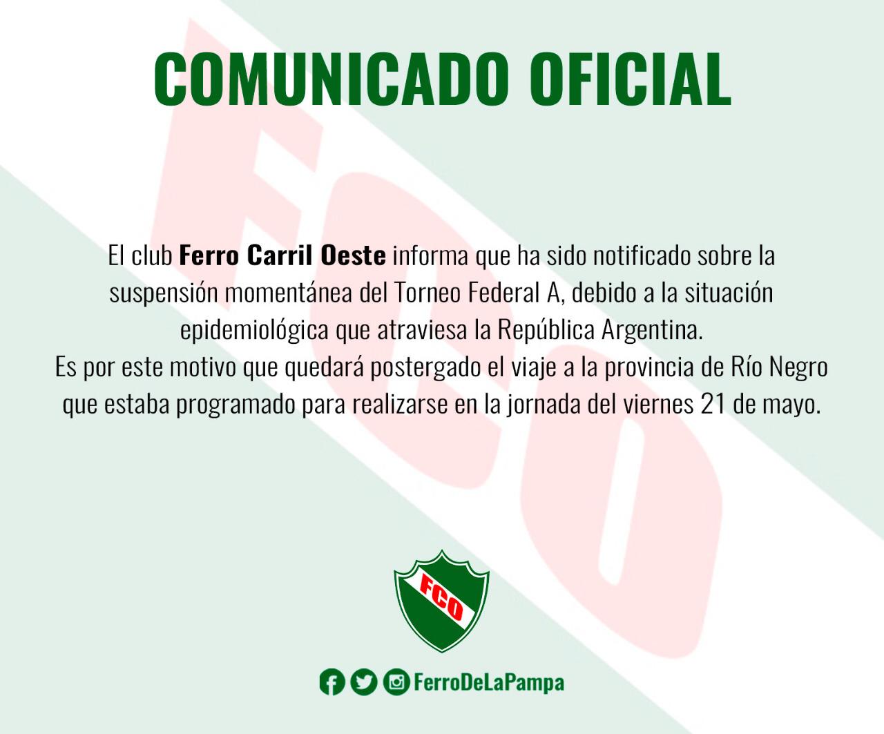 Tras la situación epidemeológica que atraviesa nuestro país el club Ferro de Pico informa que fue notificado de la suspensión ...