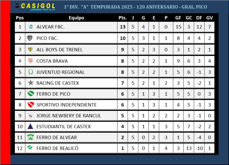 Nota: *Resta jugarse el encuentro entre Estudiantil y All Boys de Trenel, suspendido por lluvia. En esta tabla otorgamos los puntos que consigue hasta aquí Alvear FBC. ante Costa Brava en el triunfo parcial por uno a cero, del partido suspendido a los 6' del complemento , cuya continuidad quedará a criterio de lo que resuelva Liga Pampeana.