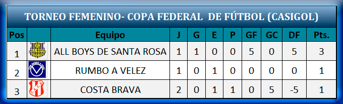 Por la Copa Federal Femenina de fútbol se disputó la segunda fecha en la "Región Pampeana Sur". All Boys de Santa Rosa recibió en el Estadio "Ramón Turnes" a Costa Brava. All Boys salió desde el primer momento a buscar el triunfo ante un Costa que planteó un partido similar al de Rumbo a Velez, mostrándose ordenado en sus líneas y cuando recuperaba buscar lastimar de contra. Pero All Boys abrió el marcador y a partir de allí fue superior porque llegó al segundo con un gol en contra tras un tiro de esquina. Ya en el complemento All Boys fue más y terminó redondeando un cinco a cero para ser líder de la Copa Federal femina de fútbol en la región pampeana sur.