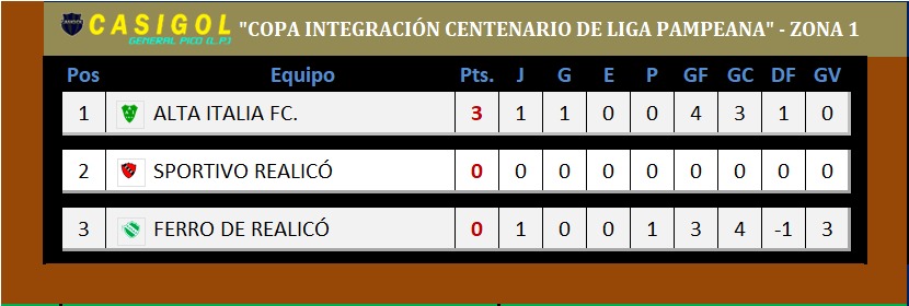 ZONA 1:  En esa zona se disputó un solo encuentro que fue el disputado en el "Jorge Tosselli" entre Alta Italia FC. y Ferro de Realicó, con el triunfo del local por 4 a 3 y ahora se espera por el encuentro clásico a llevarse a cabo en el "Cincuentenario" entre Ferro y Sportivo Realicó.