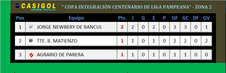 ZONA 2: En esta zona se disputaron dos fecha, en las cuales todos fueron empates hasta aquí. En la primera igualaron en Rancul  dos a dos Jorge Newbery y Tte. B. Matienzo y ayer en Parera Agrario y Jorge Newbery fue  uno a uno y se espera la definición de la zona con el encuentro que se disputará en Luiggi entre Tte. B. Matienzo y Agrario de Parera.