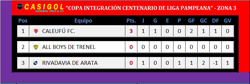 Zona 3:  En dicha zona se disputó un solo encuentro y fue el que animaron Caleufú FC. y Ricadavia de Arata en el clásico, con triunfo local por dos a uno. La zona espera por el debut de All Boys de Trenel que deberá viajar hacia el "Semillero Celeste" para enfrentar a Rivadavia en la segunda, para cerrar luego en su casa recibiendo a Caleufú FC.
