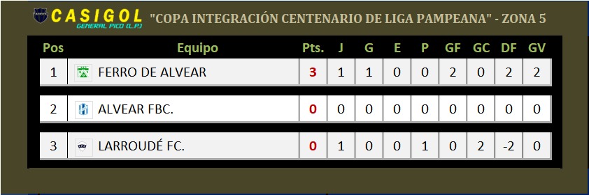 La Copa Integración "Centenario de Liga Pampeana", tuvo actividad en las ocho zonas que la componen. Anoche movió en esta particular competencia la zona 5, con el encuentro  entre Larroudé FC. (hizo las veces de local en el "11 de julio") y Ferro de Alvear.