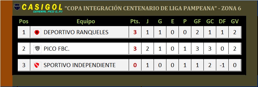 Zona 6: Anoche se disputó el encuentro de la segunda fecha en "el Volcán", con el clásico entre Sportivo Independiente y Pico FBC.  con triunfo "decano" por dos a uno. La zona se cierra con el encuentro entre Deportivo Ranqueles, que será local de Sportivo Independiente y allí se definirá quien será su ganador.