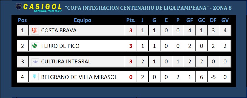 Zona 8:  Esta es la única zona que tiene cuatro equipos, y se disputaron, tres encuentros en los cuales Cultura Integral se impuso a Belgrano de V. Mirasol en el clásico, para luego caer con Ferro en su casa, y Belgrano, ya eliminado, perder con Costa en su segunda presentación.  Restan jugar Costa Brava y Cultura Integral, Ferro de Pico con Belgrano y el clásico Ferro de Pico Costa Brava, para que se defina la zona.