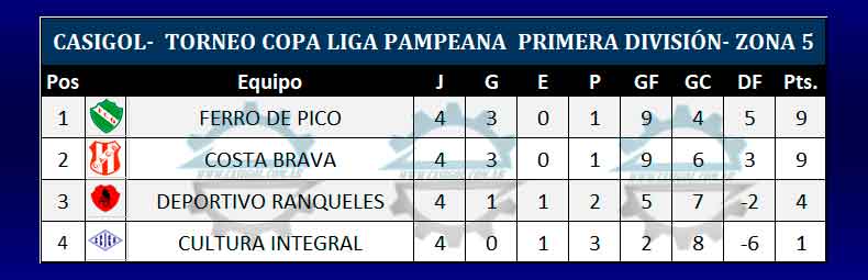 En el día de hoy se disputó  se completó la fecha cuatro del torneo Copa Liga Pampeana con el encuentro por la zona 5 entre Costa Brava y Ferro de Pico en el clásico.