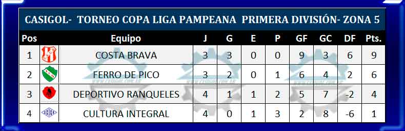 En el día de hoy se disputó grarn parte  de la cuarta fecha del torneo Copa Liga Pampeana.  La misma había comenzado el pasado jueves con el clásico entre Estutiantil y Racing, prosiguió el fin de semana con el grueso de los partidos y finalizará en el día de mañana con el clásico entre Costa Brava y Ferro de Pico.