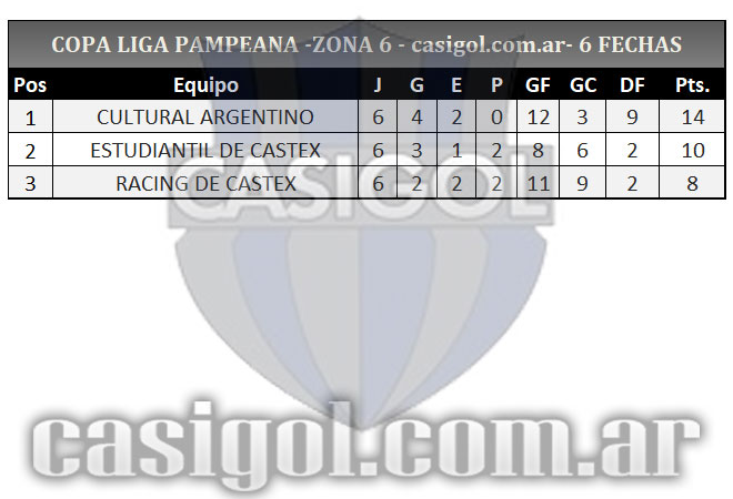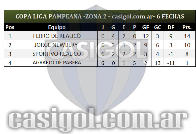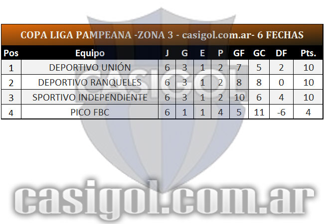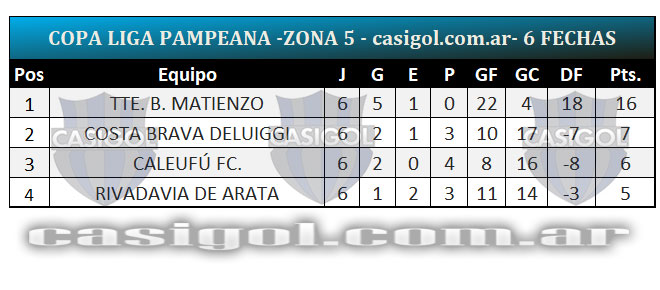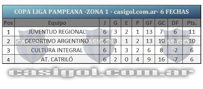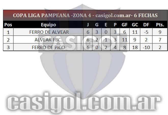 Se completó la sexta y última fecha del torneo Copa Liga Pampeana que tuvo un adelantado del jueves por la zona cuatro en el partido que Alvear FBC derrotó a Ferro de Pico por cuatro a cero. Tras la finalización de la fase regular estos son los ocho clasificados y así quedaron los cruces de cuartos de final.