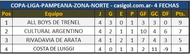 Se completó la cuarta fecha del torneo Copa Liga Pampeana de fútbol, con los partidos disputados en el estadio "Meridiano V" entre el local At. Catriló y Dep. Ranqueles y en el "José Manuel Garay" donde Costa Brava de Luiggi hizo  las veces de local recibiendo a Rivadavia de Arata.
