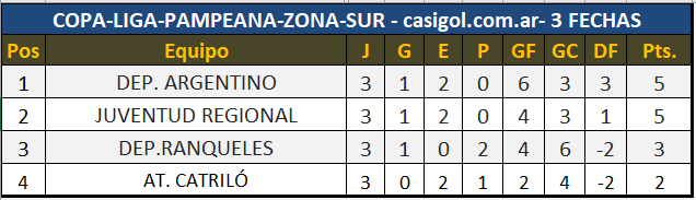 Se completó la tercera fecha del torneo Copa Liga Pampeana en la zona Sur. Igualaron cero a cero Juventud Regional y At. Catriló. El jueves habían adelantado su encuentro Deportivo Argentino yDep. Ranqueles encuentro en el cual venció el conjunto de Quemú.