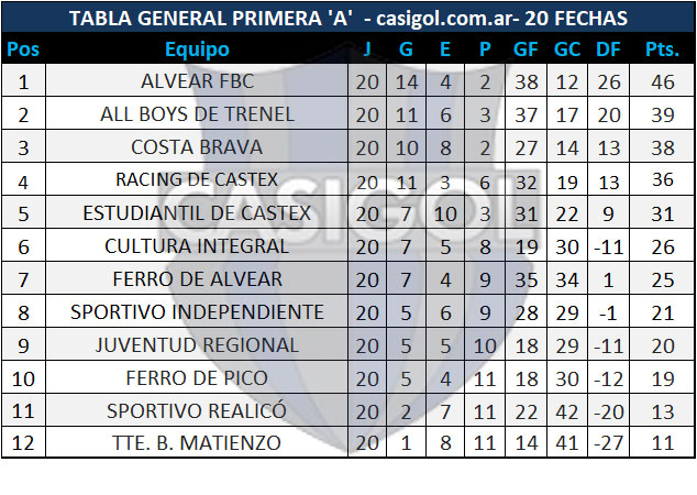 TABLA GENERAL DE POSICIONES PRIMERA DIVISIÓN