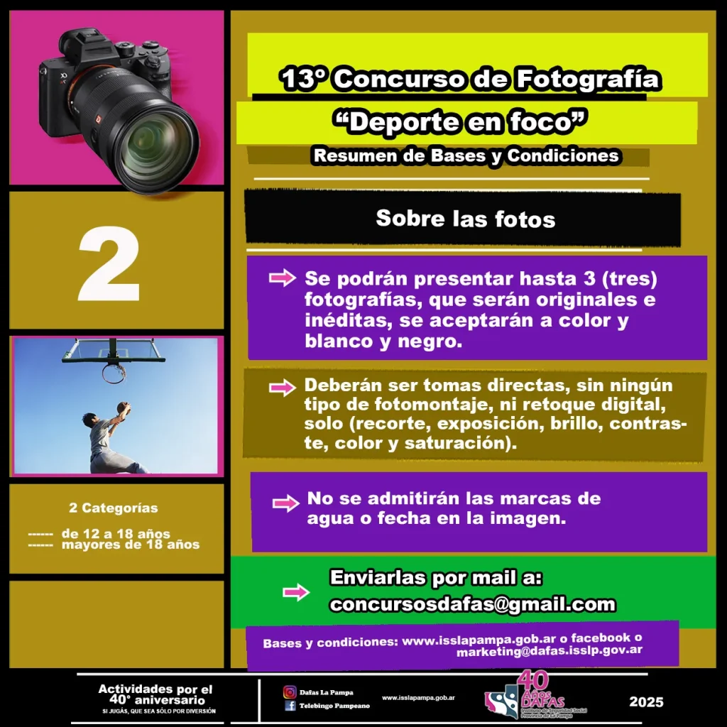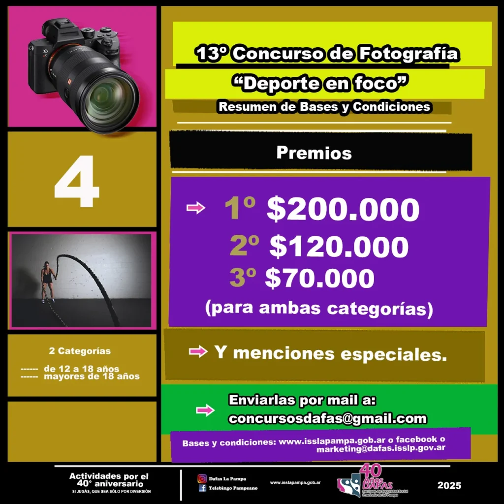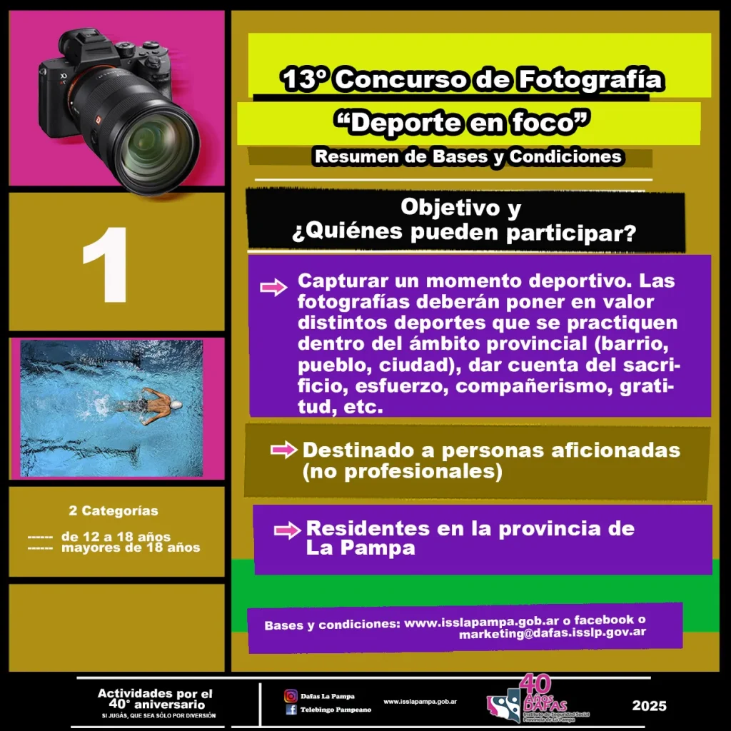 La Dirección de Ayuda Financiera para la Acción Social (DAFAS) invita a personas aficionadas a la fotografía, residentes en La Pampa, a participar durante todo el mes de abril del 13° concurso de fotografía digital “Deporte en foco”, actividad que integra un amplio programa anual de actividades por el 40° aniversario de la institución.