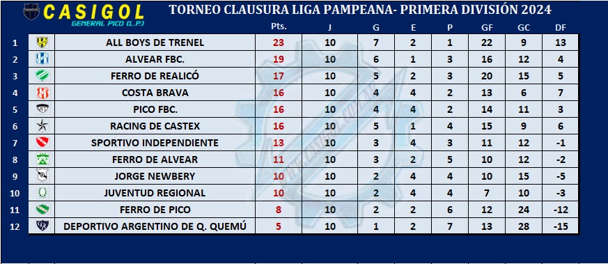 En la tarde de hoy se completó la décima fecha del torneo clausura de fútbol de Liga Pampeana. Recordamos que todo comenzó en el día de ayer con los triunfos de All Boys deTrenel, y Alvear y culminó hoy con la victoria de Costa, Sportivo Independiente, Pico FBC y el empate en Cané.
