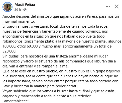 Lo grave fue lo denunciado públicamente por el goleador del conjunto local Máximo Peña, a través de sus redes sociales, quien manifestó el mal momento vivido al término del encuentro, debido a que al ingresar al vestuario se encontraron con mucho desorden y que les habían robado dinero. El goleador del conjunto de Parera hizo referencia al hecho y manifestó lo siguiente a través de Facebook.