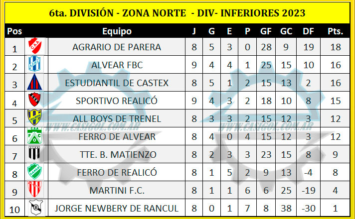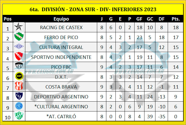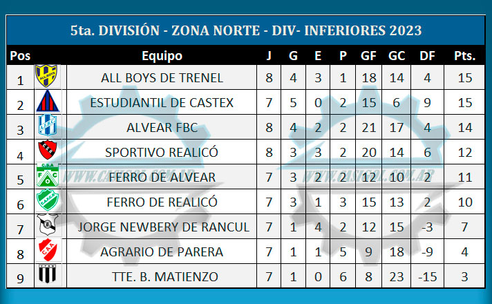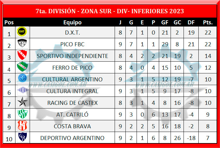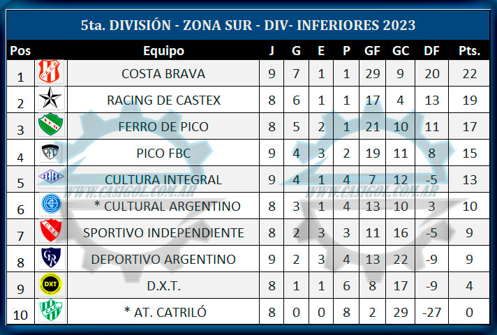 n la tarde de hoy se disputaron más encuentros adelantados de la novena fecha de inferiores que se completará en el día de mañana sábado. Recordamos que la misma comenzó en el día de ayer con el triunfo en séptima de At. Catriló sobre Cultural Argentino y la suspensión en sexta y quinta. Hoy jugaron en el "Carlos Sierrra" Deportivo Argentino y Pico FBC y en el "Oscar Avelino Dolce" Cultura Integral y Costa Brava por la zona Sur, en tanto que por la norte hicieron lo prpio en el "Parque Rojo " Sportivo Realicó y Alvear FBC. todos en las tres categorías con la siguiente síntesis.