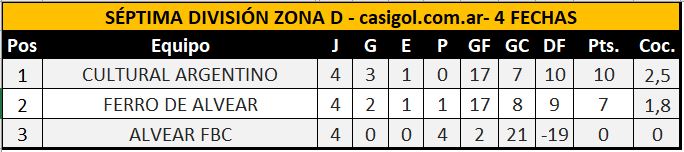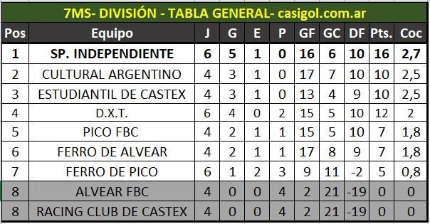 Los clasificados de séptima división se computan del uno al ocho agrupados en una tabla general organizada por cociente.