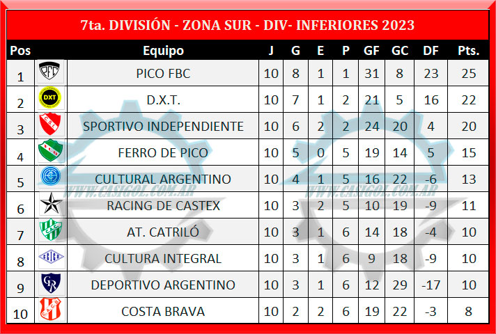 Se disputó la décima fecha de divisiones inferiores, (primera de las revanchas) con los partidos de séptima, sexta y quinta división en las zonas norte y sur del torneo oficial. Los siguientes fueron los resultados las tablas y lo que se viene en la décima primera de la segunda rueda. La jornada comenzó a las 11 horas en cancha del Deportivo Ranqueles con el partido DXT Pico FBC y el resto de la fecha continuó con el resto de los partidos en horario oficiail.