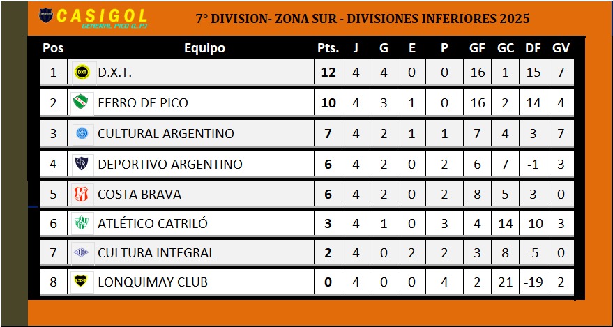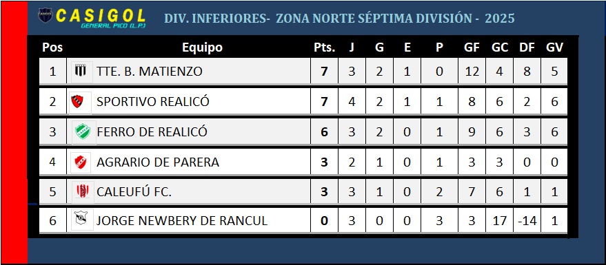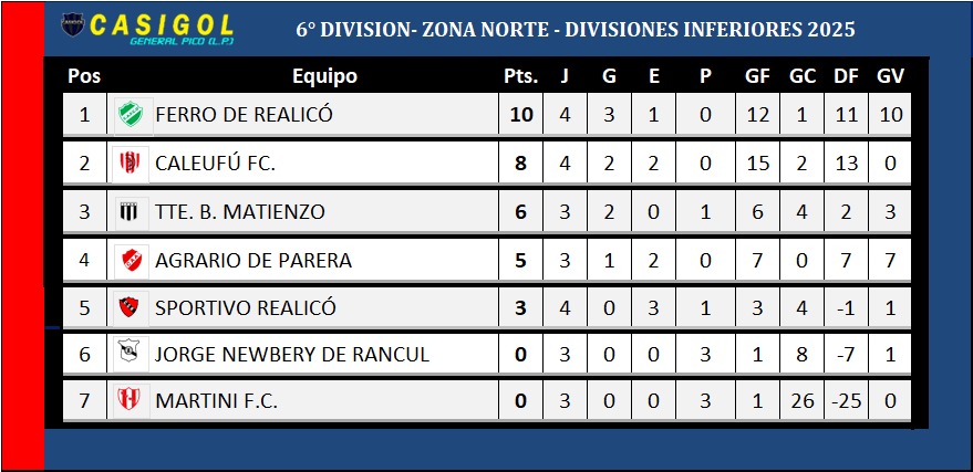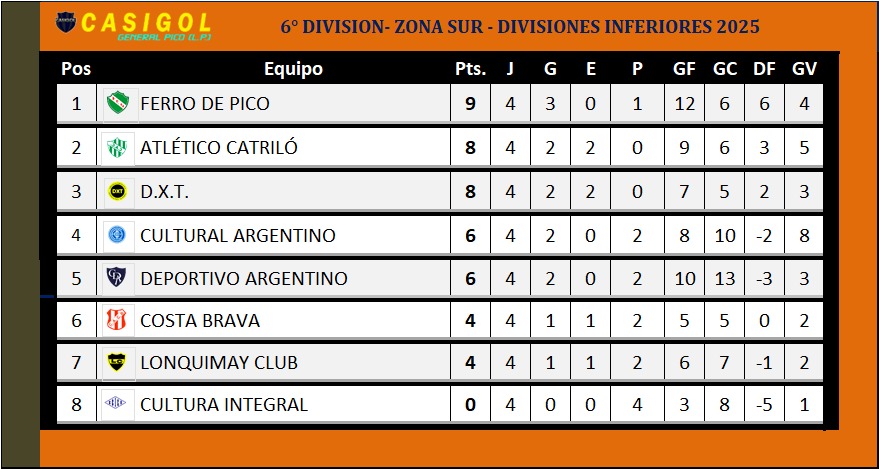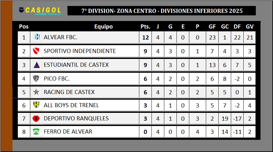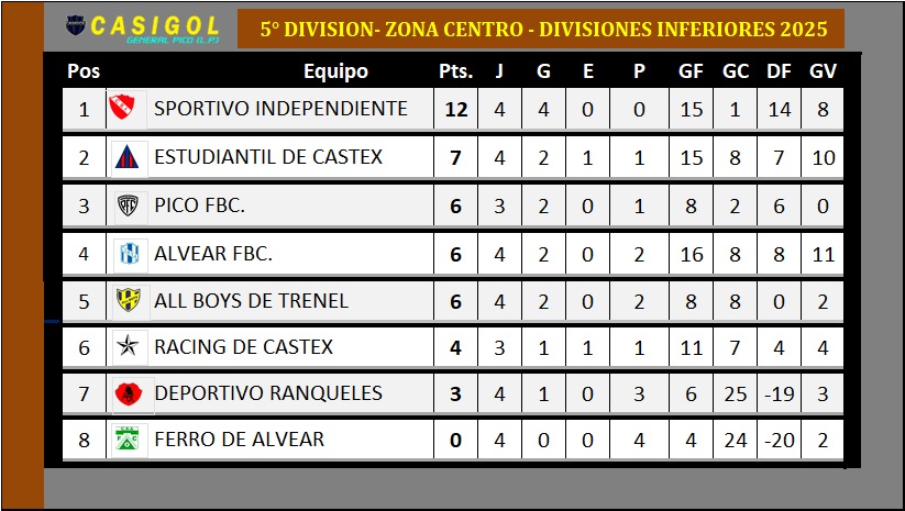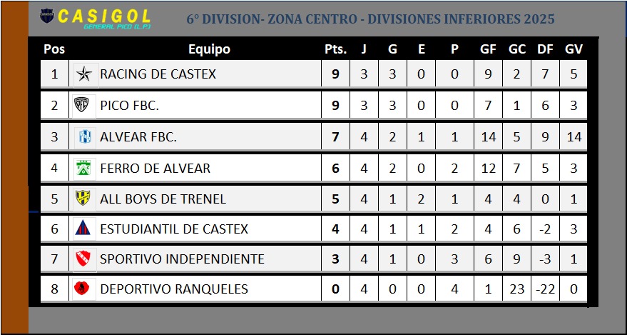 Nota: El encuentro entre Pico FBC. y Racing de Castex fue suspendido por mal clima cuando Pico lo ganaba por uno a cero. EN nuetra tabla sumamos los tres puntos que hasta aquí conseguía el "decano". Se modificará nuevamente si cambia el resultado cuando finalice el partido.