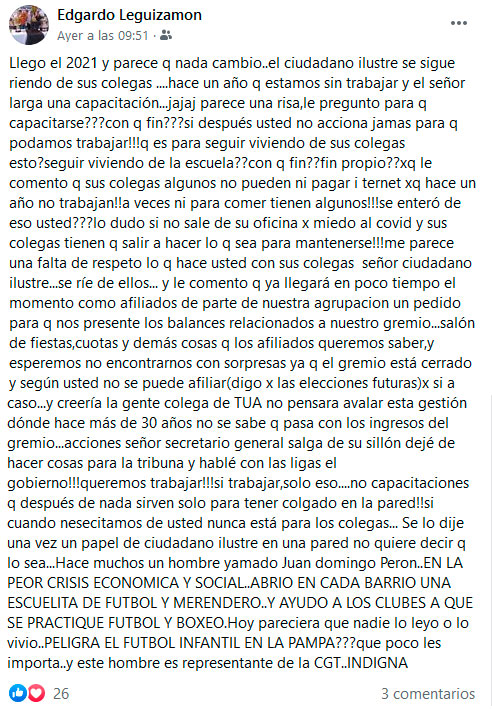Aunque en ningún momento se refiere con nombres propios podemos inferir que el posteo va dirigido a la actual dirigencia de ATFA de La Pampa, a la cual le solicitó que hable con las Ligas, con el gobierno, porque no sirven las capacitaciones si no hay fútbol y no tenemos la posibilidad de trabajar.