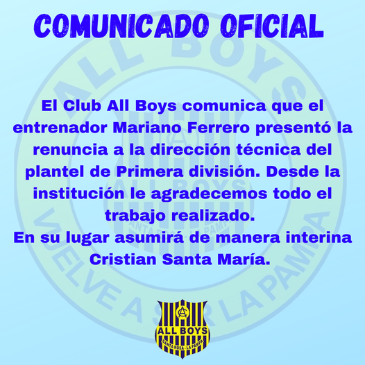 La cuenta oficial de Facebook del club All Boys de Santa Rosa informó que el técnico Mariano Ferrero renunció a la dirección técnica del primer equipo de la capital pampeana.