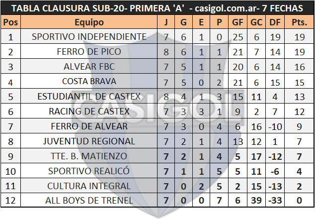 TABLA DE POSICIONES CLAUSURA -SUB 20