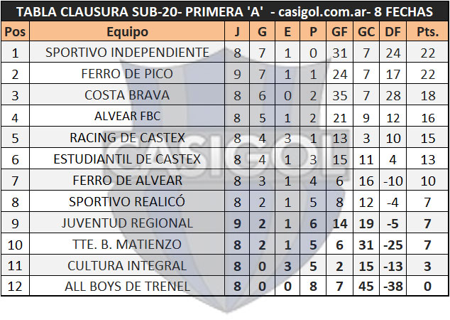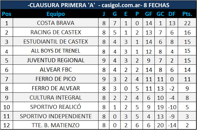 TABLA DE POSICIONES CLAUSURA CATEGORÍA PRELIMINAR