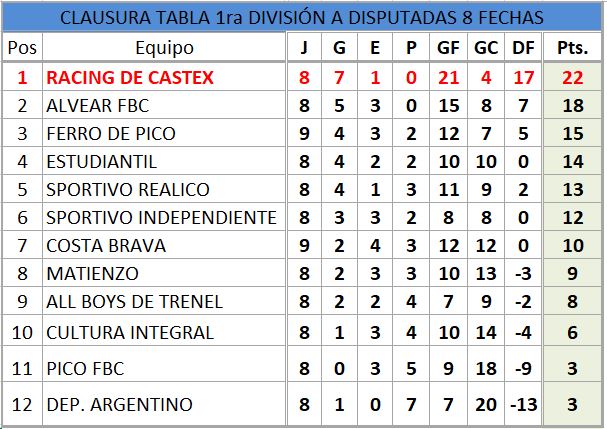 TABLA DE POSICIONES TORNEO CLAUSURA