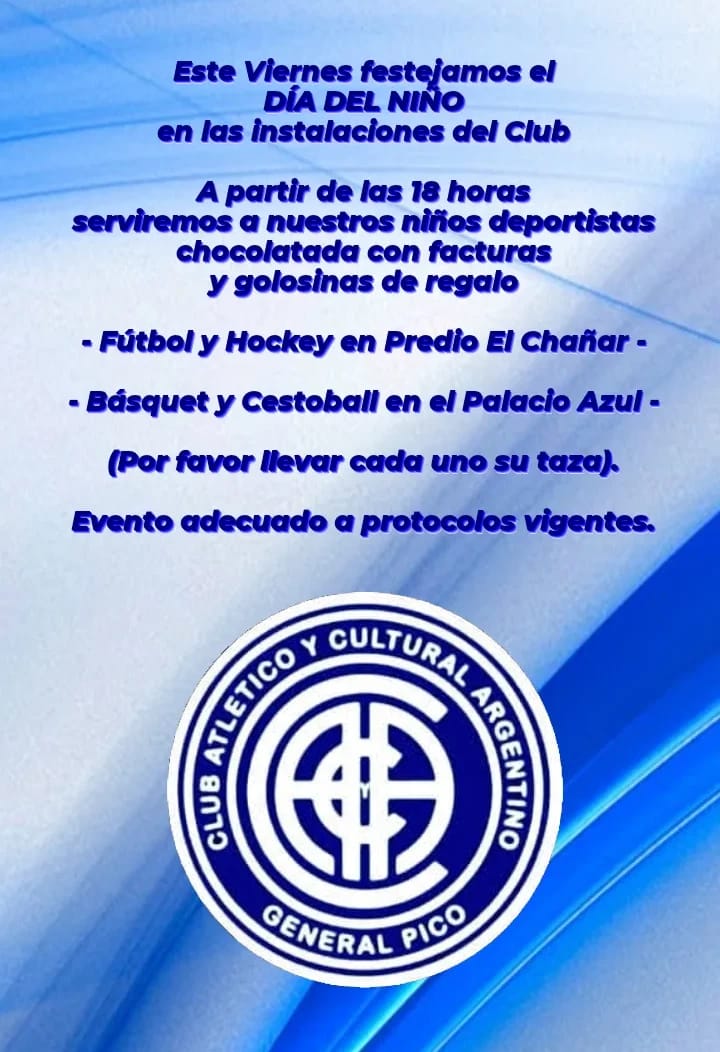 Con motivo del día del niño, en el día de hoy a partir de las 18:00hs., el club Cultural Argentino lo festejará en sus instalaciones sirviendo a sus niños deportistas chocolatada con facturas y les regalarán golosinas. EL club informa que el evento para las actividades de fútbol y Hokey se desarrollará en el predio "El Chañar", en tanto que para Básquet y Cestoball será en el "Palacio Azul". Recomiendan que cada niño que concurra lleve su taza y que dicho evento fue adecuado según los protocolos vigentes que rigen para la realización del mismo.