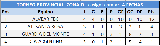 Dio inicio la cuarta fecha del torneo provincial masculino de primera división José "topo" González, con el encuentro en Intendente Alvear que por la zona D, disputaron Alvear FBC y Guardia del Monte. El encuentro favoreció al local que selló el triunfo con una goleada por cinco a cero sobre el conjunto de Toay. Los goles los marcaron Rosón, Sosa, Bertaina, Cuello y RIvadero. La visita finalizó con un hombre de menos por la expulsión de Alvarez.