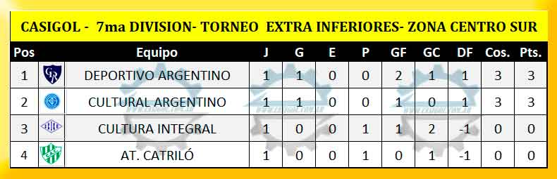 Anoche en el "Carlos Sierra" de Quemú Quemú, se completó la primera fecha del torneo extra de divisiones inferiores en la zona centro Sur.  Se enfrentaron el local Deportivo Argentino y Cultura Integral de Colonia Barón, en las tres categorías.  En séptima se impuso el local por dos a uno, en sexta igualaron sin abrir el marcador y en quinta fue el conjunto de Colonia Barón quien se llevó los tres puntos venciendo por uno a cero.