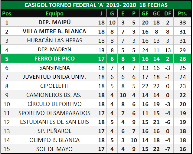 Ferro de Pico (26), recibirá a Deportivo Madryn (29) hoy a las 21:30hs. en el Coloso. El encuentro es válido por la quinta fecha de las revanchas de la zona "B" del torneo Federal "A" de fútbol. El cuarto y el quinto se miden y para el verde de nuestra ciudad es de trascendental importancia este partido, dado que si deja los tres puntos en casa, alcanzará a su rival y llegará al cuarto lugar en la tabla de posiciones. Los de Giganti no contarán con la presencia del primer marcador central Pablo Agüero suspendido,  pero  su lugar podría ser ocupado por Nelson Benitez o Alan Gonzalez y está en condiciones de regresar Enzo Martínez quien podría regresar como lateral izquierdo. Para los espectadores que quieran concurrir temprano, tendrán el acto inaugural del torneo de fútbol infantil "cebollitas" y con la misma entrada podrán presenciar el encuentro de la tercera categoría del fútbol Argentino.