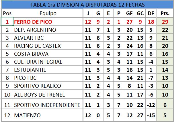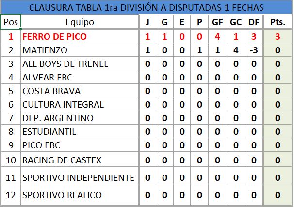 TABLA DE POSICIONES TORNEO CLAUSURA