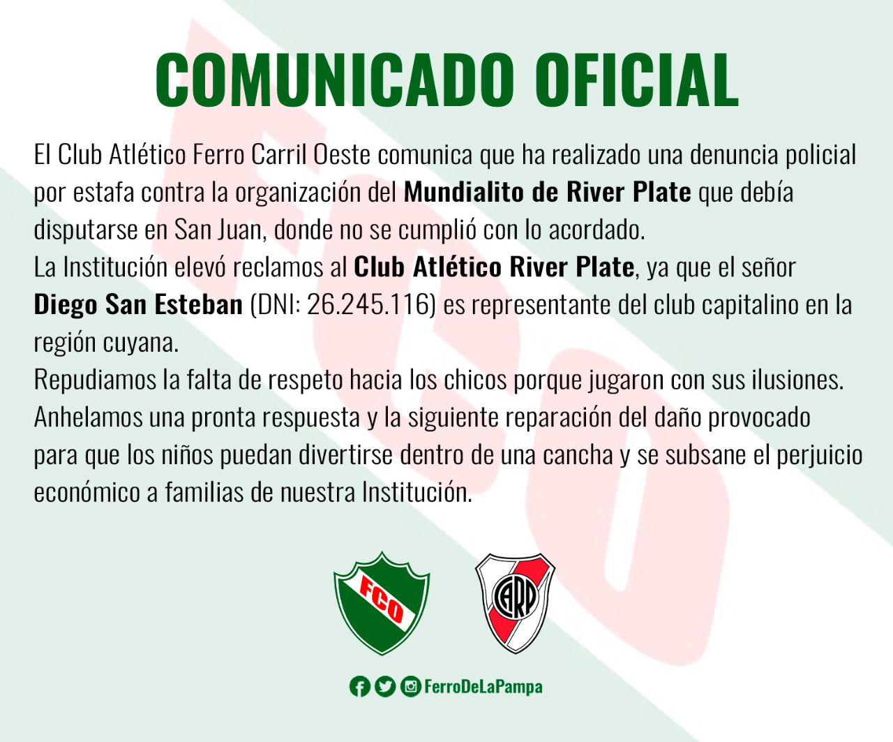 El club Ferro Carril Oeste de nuestra había viajado la semana pasada a San Juan a disputar un mundialito que organizado por un cazatalentos vinculado a River Plate y fue estafado en dicho torneo. Por tal motivo el club verde de nuestra ciudad denunció que fue estafado porque el torneo no fue lo que le habian dicho sería y realizó una denuncia policial por estafa contra la organización del torneo y emitió este comunicado oficial.