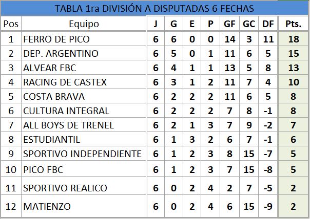 Por la sexta fecha del torneo Apertura de fútbol de Liga Pampeana los punteros se enfrentaron a Sportivo Independiente y All Boys de Trenel respectivamente, Costa se presentó en Luiggi y Pico recibió a Racing en el olímpico.